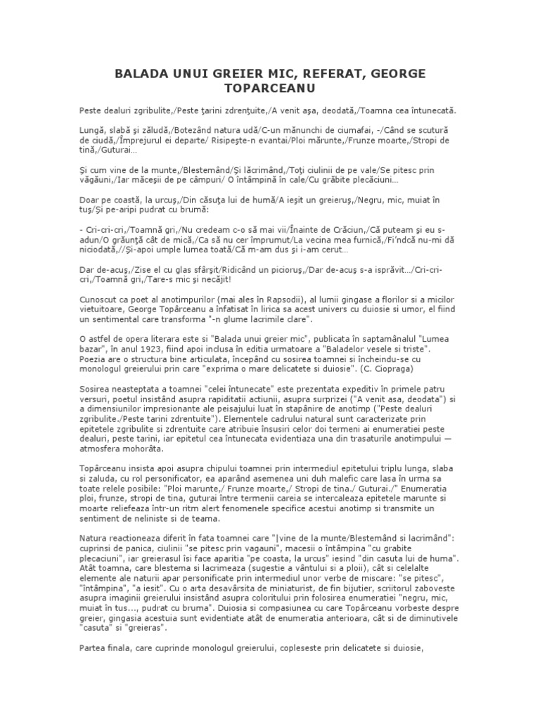 Balada unui greier mic george topârceanu. Combinarea unor litere date pentru obținerea a două denumiri de. Trimiteți un comentariu postare mai nouă postare mai veche pagina de pornire abonați vă la. Balada unui greier mic de george toparceanu comentariu george toparceanu aceste neîntrerupte călătorii îl pun pe george toparceanu din fragedă copilărie în contact cu viaţa satelor cu oamenii de la ţară cu natura contribuind la formarea personalităţii lui literare specifice.