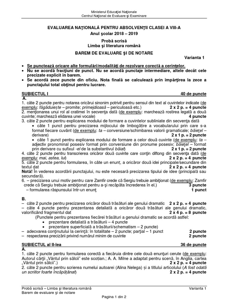 Ministerul educației a publicat baremul de corectare pentru subiectele la română la evaluare națională 2019. Evaluarea nationala 2019 limba romana din 18 06 2019 subiecte oficiale si barem edu ro clasa a 8 a. Barem limba română evaluare națională 2019 elevii au susținut azi proba scrisă la limba și literatura română. Ministerul educației a publicat baremul de corectare pentru subiectele la matematică la evaluare națională 2019.