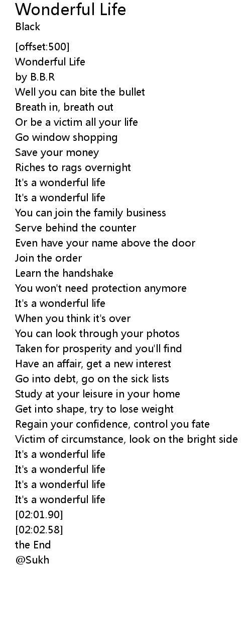 Black wonderful life lyrics. It s a wonderful wonderful life no need to laugh and cry it s a wonderful wonderful life the sun s in your eyes the heat is in your hair they seem to hate you because you re there and i need a friend oh i need a friend to make me happy not stand here on my own chorus i need a friend oh i need a friend to make me happy not so alone repeat. Lyrics to wonderful life by black. It was released twice as a single and was successful the second time becoming a top ten hit in austria france germany italy switzerland the netherlands and the uk. Here i go out to sea again the sunshine fills my hair and dreams hang in the air gulls in the sky and in my blue eyes you know it feels unfair there s magic everywhere.