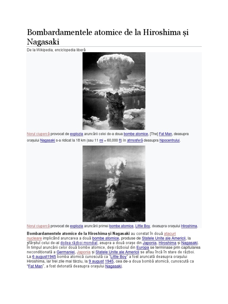 Probabil unul din cele mai cunoscute evenimente ale secolului xx bombardarea oraşelor hiroshima şi nagasaki de către americani s a concretizat nu doar într o dramă niponă ci a constituit şi singurul prilej şi sperăm că ultimul în care s au folosit arme nucleare. Bibliografie minimală bușe constantin zorin zamfir japonia un secol de istorie 1853 1945 editura humanitas bucurești 1990. Decizia lansarii bombei atomice asupra japoniei japonia in 1945 pentru japonia infrangerea era iminenta. Bombardamentele atomice de la hiroshma si nagasaki de pe 6 si respectiv 9 august 1945 nu numai ca au sters de pe fata pamantului cele doua metropole japoneze dar au luat cu ele si viata a peste 200 000 de oameni dacă hiroshima a însemnat pentru administrația americană o măsură de ultimă instanță prin care s a încercat încheierea războiului cat mai repede și cu cât mai puține.