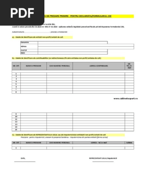 Borderou pentru depunere d 230 pe hartie la anaf. In esenta circulara in cauza specifica clar ca si noi cerninte la depunerea mai multor declaratii daca se depune de ong unitate de cult pentru mai multe persoane se depun toate d 230 cu borderou in fata iar daca borderoul nu este semnat de repr. Acest document mai prevede si prelungirea termenului de depunere pentru declaratia unica 30 iunie 2020 dar si alte facilitati cum ar fi amnistia fiscala. Formularul 230 reprezinta cerere privind destinatia sumei reprezentand 2 sau 3 5 din impozitul anual pe veniturile din salarii si din pensii cerere privind destinatia sumei reprezentand pana la 3 5 din impozitul anual datorat conform.
