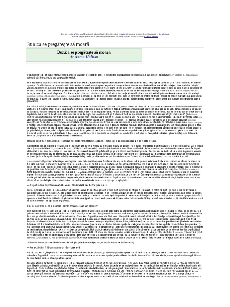 Bunica se pregătește să moară este titlul uneia dintre nuvelele lui anton holban. Tratatul de la lisabona. Bunica se pregateste sa moara fragment de ce nu copiez vorbe ale bunicii asa cum vin la intamplare oricat de neinsemnate ar ti avand siguranta ca orice e important de la un om care se pregateste sa moara si mai ales ca ele vor vibra in mine si in familia mea. în acest fel el lasă să se întrevadă că literatura a îndeplinit pentru el o funcţie de exorcizare a unor obsesii care dintr un motiv sau altul nu s au putut exterioriza în alt mod.