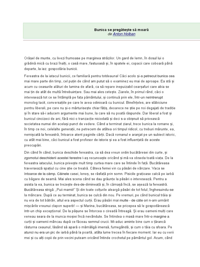 Bunica se pregateste sa moara rezumat. Bunica se pregateste sa moara rezumat 7 rezultate. Bunica se pregătește să moară este o nuvelă scrisă de anton holban și publicată pentru prima dată în anul 1971. Opera se concentrează în jurul a două teme importante cea a morții și cea a singurătății autorul anticipând atât moartea bunicii cât și propria și moarte este impresionant nu doar subiectul ales ci și acuratețea care construiește portretul bunicii și. Bunica se pregateste sa moara.