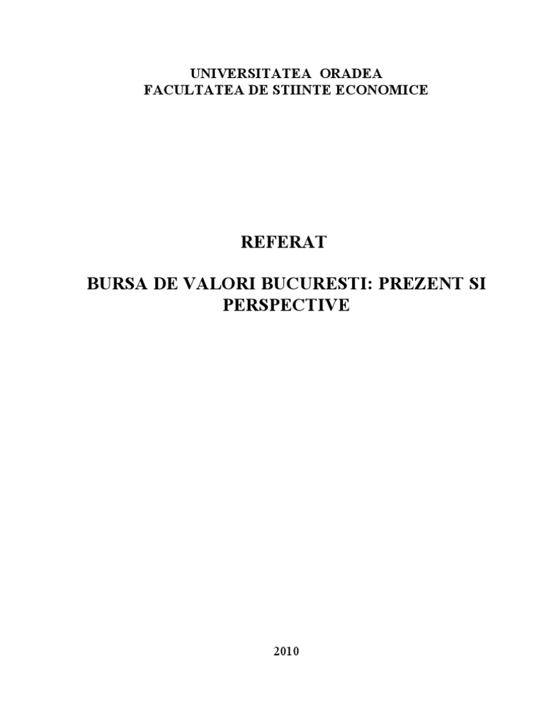 Acest referat descrie bursa de valori bucuresti. Dup o perioad de ntrerupere de 50 de ani bursa de valori bucureti s a redeschis la 23 iunie 1995 prin fondarea asociaiei bursei de ctre 20 de societi de valori mobiliare. Document util pentru elaborare de lucrari de licenta diploma proiecte disertatie referate etc. Bursa este o piaţă pe care se oferă şi se desfac după o procedură specială mărfuri sau valori mobiliare.