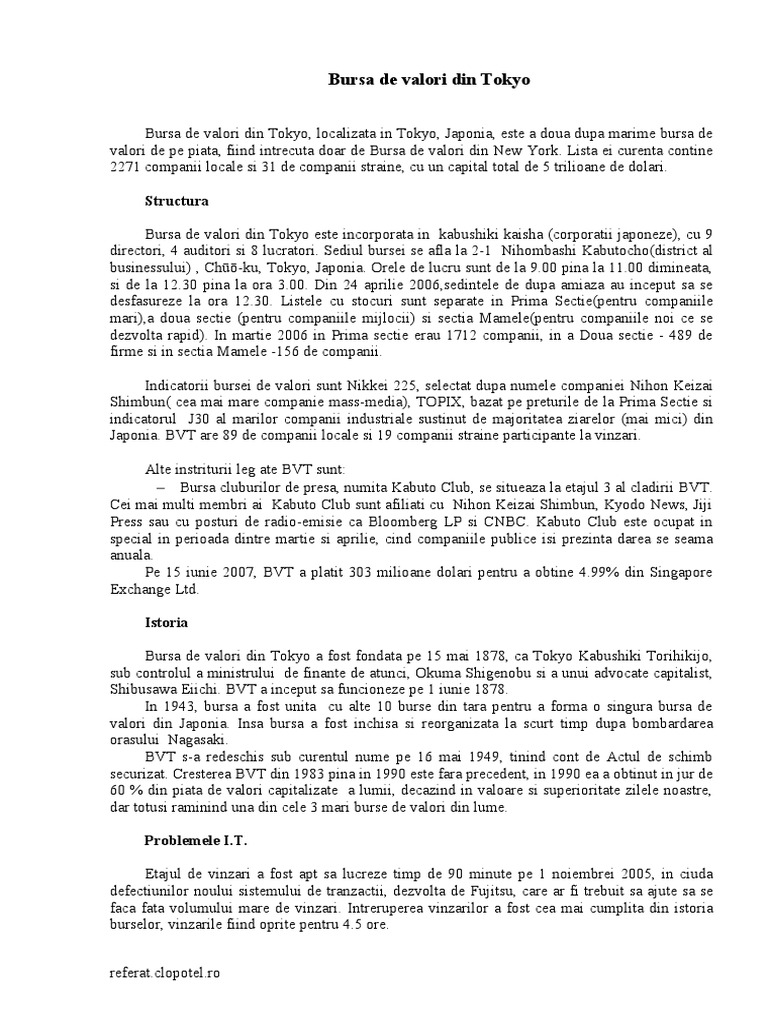 Arhiva contine 1 fisier doc de 20 pagini. Indiferent de forma ei juridica care poate fi de drept public sau de drept privat bursa de valori functioneaza sub controlul si supravegherea guvernului. A valori mobiliare titluri financiare. La 20 noiembrie 1995 cu sprijinul unor experi din canada bursa i a nceput activitatea n mod efectiv avnd nscrise la cot 6 societi comerciale ale cror valori mobiliare erau tranzacionate n cadrul unei singure edine pe sptmn.