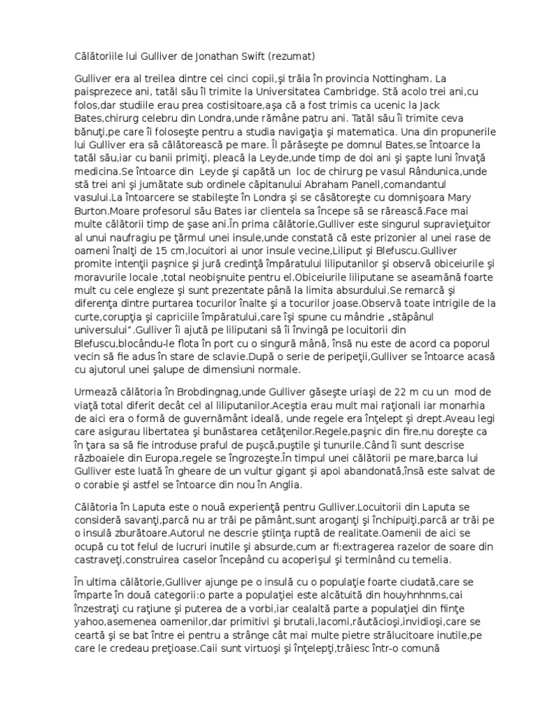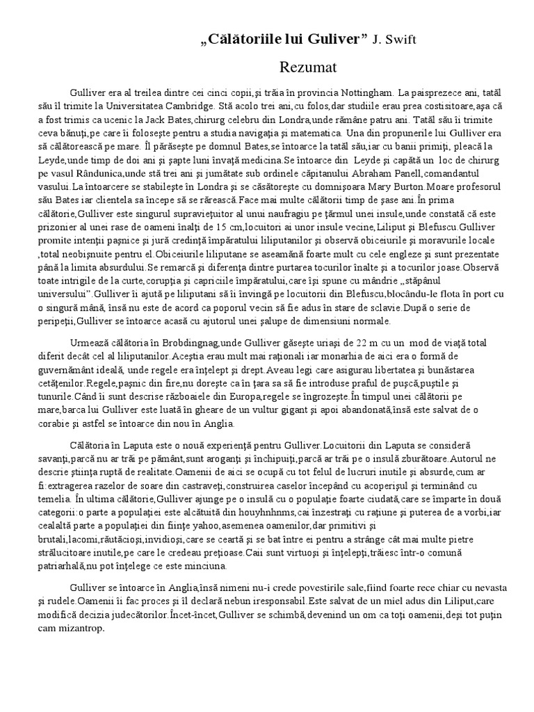 Calatoriile lui gulliver fisa de lectura. Una din propunerile lui gulliver era să călătorească pe mare. Editorul cărții a publicat prima ediție în 1726 cu numeroase modificări aduse textului original temându se că anumiți. Vineri 28 noiembrie ora 18 00 copiii și părinții sunt invitați la un spectacol lectură ce are drept sursă de inspirație volumul călătoriile lui gulliver apărut la curtea veche publishing în colecția cărțile copilăriei. La unul dintre ele află că marile dregătorii li se dădeau celor care ieşeau învingători la dansul acrobaţilor la înălţime pe o frânghie subţire şi elastică.