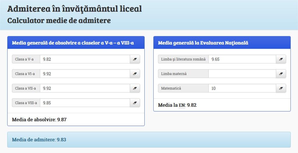 Poti face o simulare a mediei de admitere la liceu aici. Evaluarea nationala si admiterea la liceu se apropie. Regulile si fisa de inscriere pentru admiterea la liceu din anul scolar 2020 2021 a fost publicata. Top medii de admitere la liceele din bucuresti.