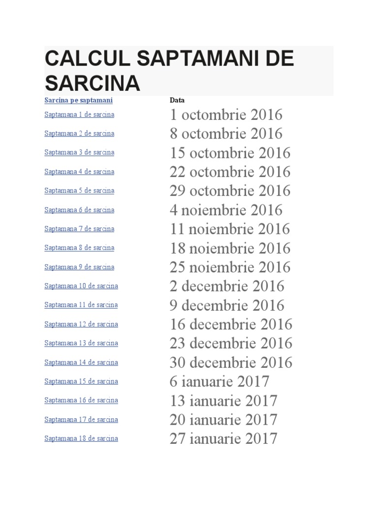 Dacă vrei să afli cu o certitudine de 100 în câte săptămâni ești însărcinată te sfătuim să îl consulți pe medicul ginecolog. O mai numim si odiseea sarcinii pentru ca ea este o calatorie in 40 de saptamani speciale in care sarcina evolueaza si merge inainte ca intr o. Sarcina pe saptamani este o calatorie de 40 de saptamani spre nasterea unei mame odata cu nasterea copilului sau. Calculator cu sarcina pe săptămâni și luni.