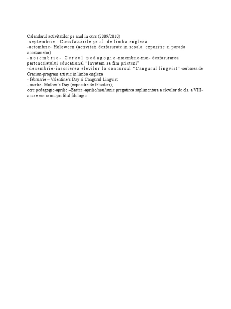 Calendarul Activitatilor Pe Anul In Curs