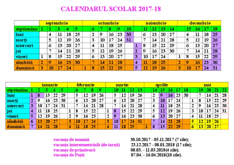 30 iunie 2017 18 03. Primul semestru al anului şcolar 2017 18 începe pe 11 septembrie 2017 şi se termină pe 2 februarie 2018. Calendar an scolar 2017 2018 structura anului scolar sursa edu ro de profesor jitaru ionel pe 11 08 2017 scrie un comentariu conform edu ro cursurile anului şcolar 2017 2018 încep luni 11 septembrie și însumează 167 de zile lucrătoare 35 de săptămâni. Calendar colorat 2017 2018 structura anului scolar.