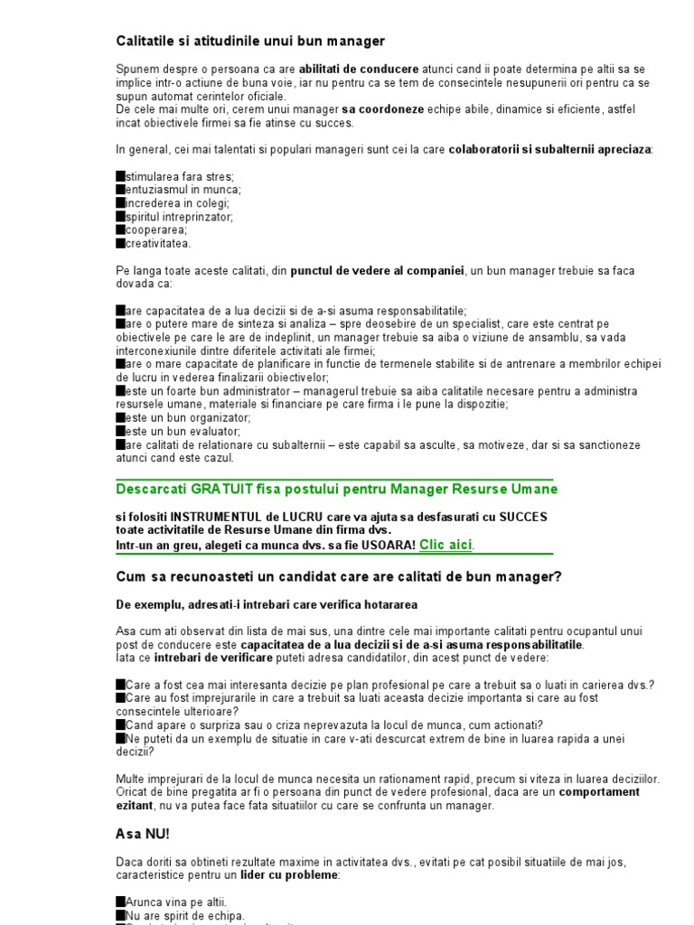 Un manager de succes este. Una dintre calitatile unui bun manager este sa aiba o viziune dar si sa stie cum s o comunice mai departe. Publicat de catre george marin. Mangerul care a derait în cariera a fost caracterizat ca fiind.